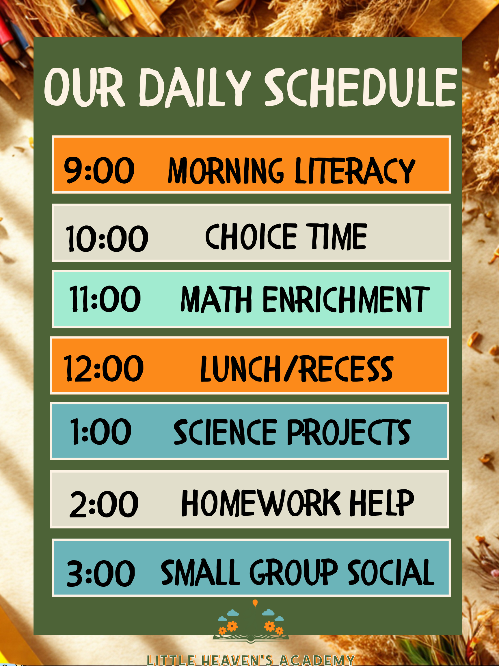 Please Note: Enrollment is limited as we are a home-based microschool. Students will be enrolled on a first-come, first serve basis. Also note – Little Heaven’s Academy is not equipped to handle children with extreme disabilities.